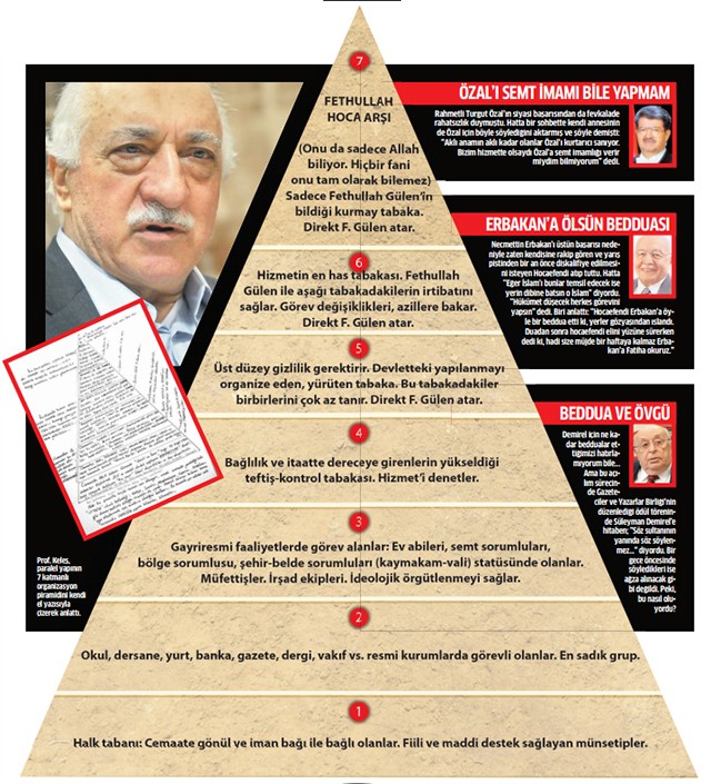 ‘Fethullah Gülen Cemaati’nde 25 yıl görev alan Prof. Dr. Ahmet Keleş, paralel yapının piramidini anlattı. Star gazetesinde yer alan habere göre; 5. kata kadar çıkan Keleş, cemaatin 1, 2 ve 3’üncü katmanının halk tabakası olduğunu, öğrenciler ve öğretmenlerin oluşturduğunu söyledi.