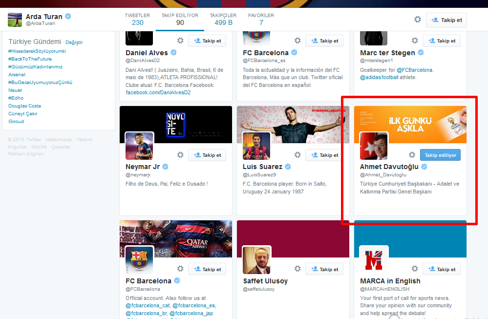 Barcelona'lı yıldız Arda Turan'ın takip ettiği 90 hesabın arasında tek siyasi isim olan Türkiye Cumhuriyeti Başbakanı ve Ak Parti Genel Başkanı Ahmet Davutoğlu'nun hesabı olduğu ortaya çıktı.