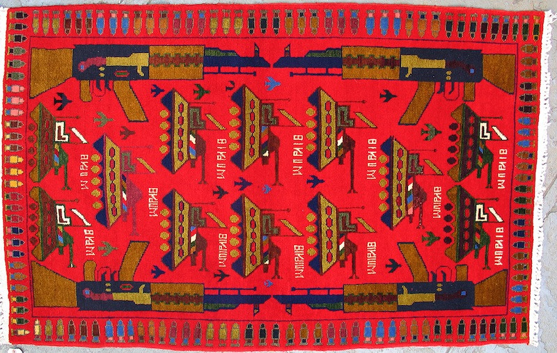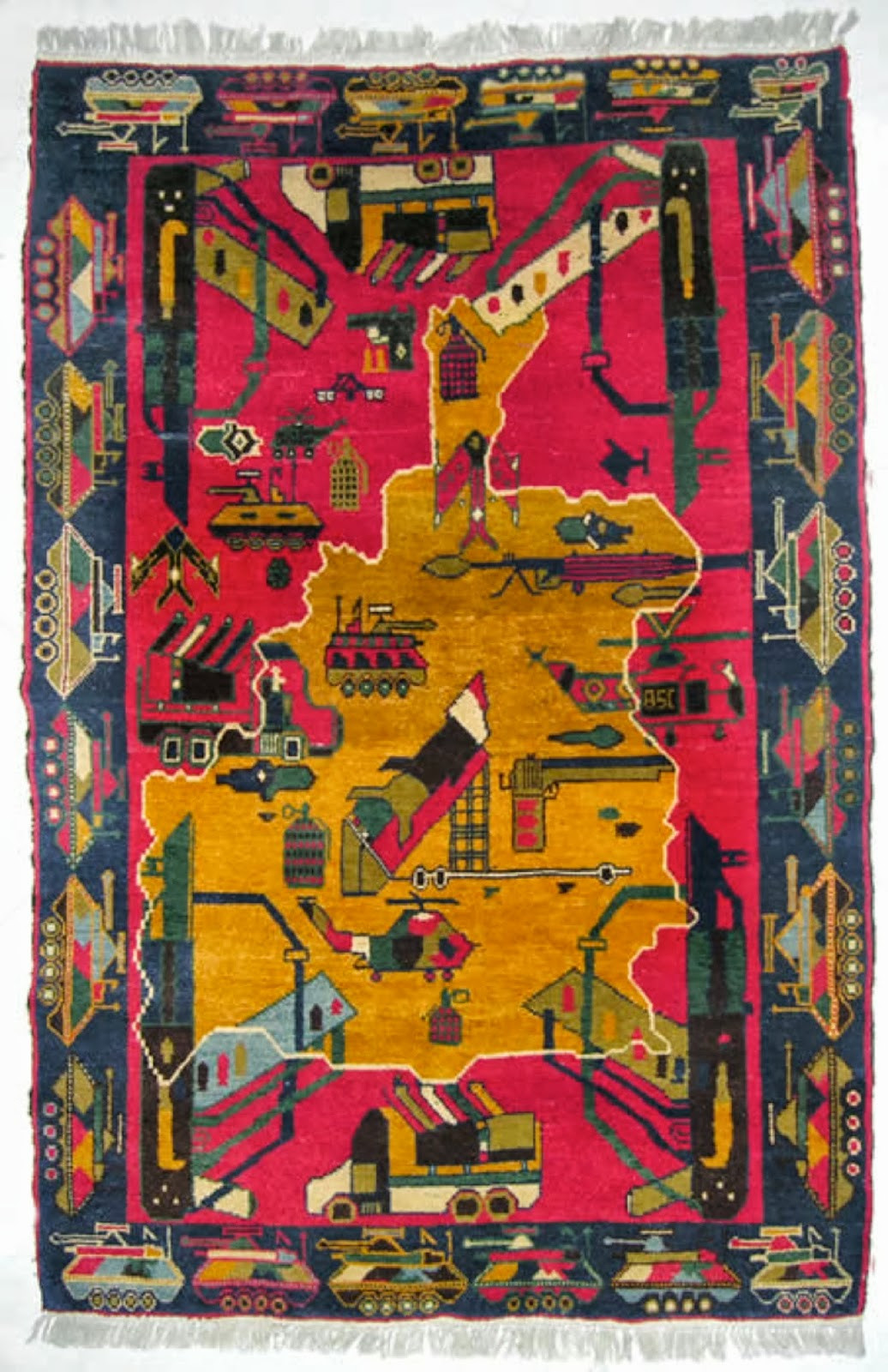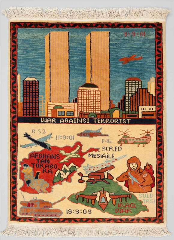 1996’da, Sovyetlerin geri çekilmesinden yedi yıl sonra, Taliban Afganistan’da yönetimi kontrolüne alıyor ve ondan kısa bir süre sonra da ülke yeniden, bu sefer de Amerikan ve koalisyon kuvvetleri tarafından istilaya uğruyor. Sergideki savaş halılarında bu çatışmaların yansımalarını görüyoruz.