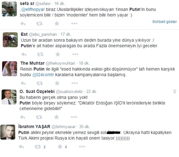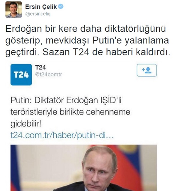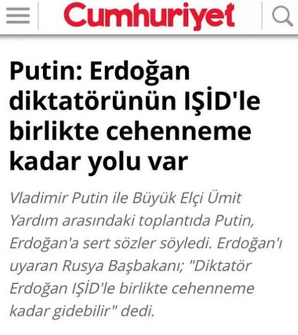 YENİAKİT.COM.TR - Cumhuriyet gazetesinin ve t24 isimli dargın Kemalistler'in internet sitelerinde bu akşam ilginç bir haber yayınlandı. Siteler, Rusya Devlet Başkanı Vladimir Putin'in, Cumhurbaşkanı Recep Tayyip Erdoğan hakkında, "Diktatör Erdoğan IŞİD'li teröristlerle birlikte cehenneme gidebilir!" dediğini iddia etti.