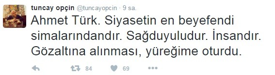 Opçin, "Ahmet Türk. Siyasetin en beyefendi simalarındandır. Sağduyuludur. İnsandır. Gözaltına alınması, yüreğime oturdu" şeklinde skandal ifadeler kullandı.