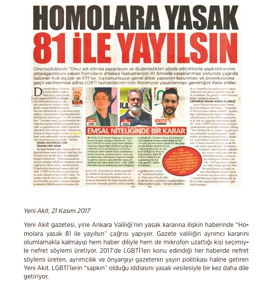 Sapkınlara hizmet eden KAOS GL 2017 Medya İzleme Raporu’nda Akit’e çirkin iftiralarda bulunuldu. Ahlaksızlıklarını yaşam biçimi haline getiren homolar, geçtiğimiz yıl haklarında yayımladığımız haberler üzerinden gazetemize yönelik asılsız iftiralara yer verdi. Sapkınlıklarını kamuoyuna duyurmamızdan rahatsız olan iblisin evlatları, kendilerine yönelik nefreti körüklediğimiz yalanına başvurdu. Akit’in aile yapımızı korumaya yönelik uyarıcı haberlerinden rahatsız olan Mor Çatı isimli şer yapılanması da gazetemizin susturulması talebinde bulunmuştu.