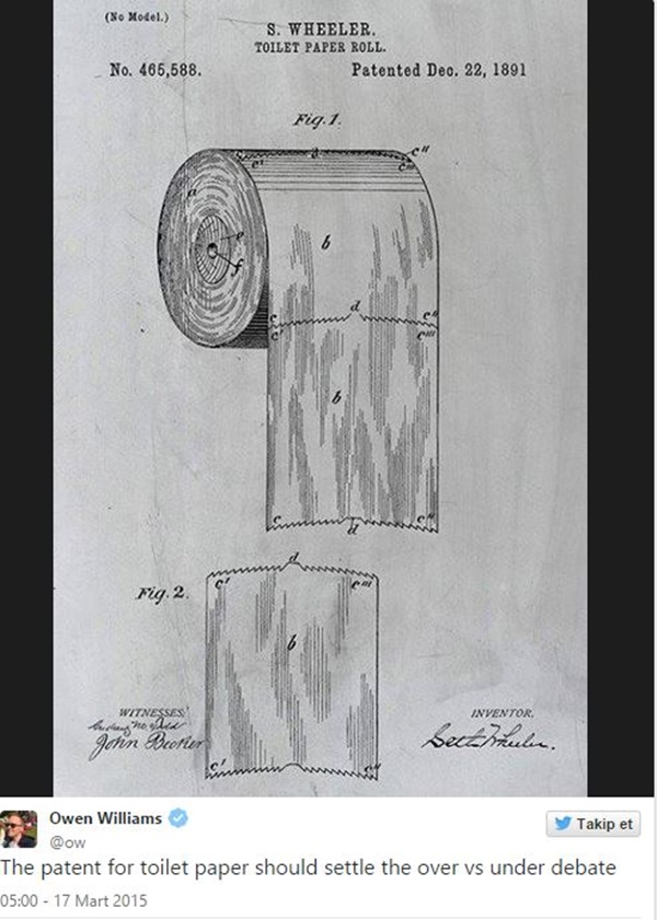 Söz konusu patent başvurusu 1891'de New York'lu iş adamı Seth Wheeler tarafından yapılmıştı. Tuvalet kağıdının hangi bölgelerden yırtılacağını, nasıl durması gerektiğini ve hangi maddeden yapıldığını açıkça gösteren çizime bakılırsa, tuvalet kağıdının yüzü öne doğru olmalı.