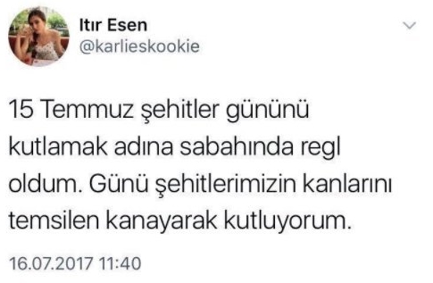 ''15 Temmuz şehitler gününü kutlamak adına sabahında regl oldum. Günü şehitlerimizin kanlarına temsilen kanayarak kutluyorum.''