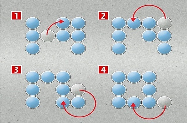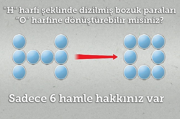 Yapmanız gereken şey “H" harfi şeklinde dizilmiş bozuk paraları “O" harfine dönüştürmek. Ancak 6 hareket hakkınız var. Paraları diğer bir paraya dokunacak şekilde her hamlenizde 1 hakkınız gidiyor.