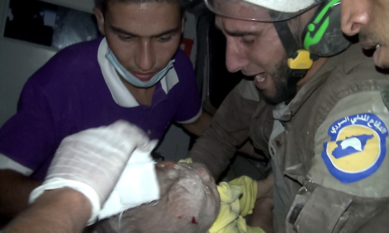 Suriye'nin İdlib kentinde savaş uçaklarının enkaza çevirdiği binadan 1 aylık Hamide bebek sağ olarak çıkarıldı. Sivil savunma görevlisi Ebu Kilfe, enkazdan çıkarttığı bebeği acil servise ulaştırırken göz yaşlarına boğuldu.