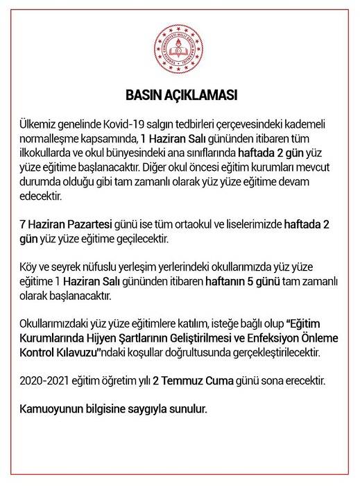 Milli Eğitim Bakanı Ziya Selçuk, milyonların merakla beklediği yüz yüze eğitime ilişkin önemli bir açıklama yaptı. Bakan Selçuk, sosyal medya hesabından “Yarın itibariyle ilkokul öğrencilerimiz, 7 Haziran Pazartesi’den itibaren ise ortaokul ve lise öğrencilerimiz için haftada iki gün yüz yüze eğitime başlıyoruz” paylaşımında bulundu. Okullarda 1 Haziran'dan itibaren yüz yüze eğitimin ise isteğe bağlı olduğu, zorunlu olmadığı belirtildi. İşte MEB tarafından yapılan basın açıklaması...