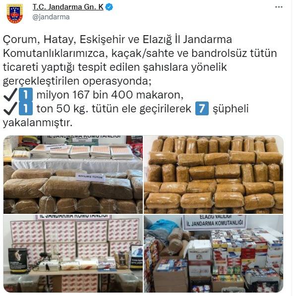 Kahraman Jandarma ekipleri tarafından kaçakçılıkla mücadele operasyonları hız kesmeden devam ediyor. Çorum, Hatay, Eskişehir ve Elazığ’da yapılan operasyonlara ilişkin Jandarma Genel Komutanlığı resmi sosyal medya hesabı üzerinden verileri paylaştı. Jandarma Genel Komutanlığı resmi sosyal medya hesabından yapılan paylaşımda, “Çorum, Hatay, Eskişehir ve Elazığ İl Jandarma Komutanlıklarımızca, kaçak/sahte ve bandrolsüz tütün ticareti yaptığı tespit edilen şahıslara yönelik gerçekleştirilen operasyonda; 1 milyon 167 bin 400 makaron, 1 ton 50 kg. tütün ele geçirilerek 7 şüpheli yakalanmıştır” ifadeleri kullanıldı.