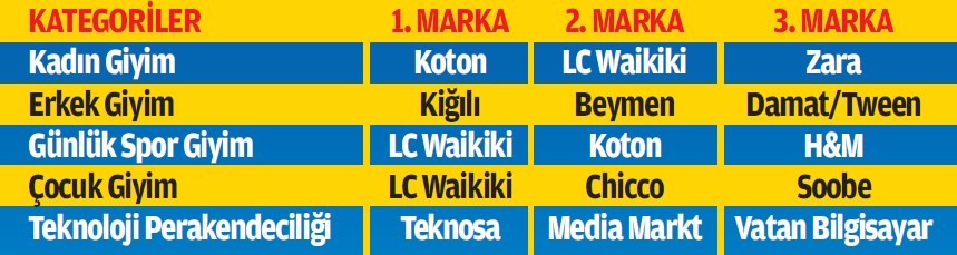 15 kategoride verilen Türkiye’nin 1 Numaralı Markaları için belirlenen sektör adaylardan bazıları ise şunlar: