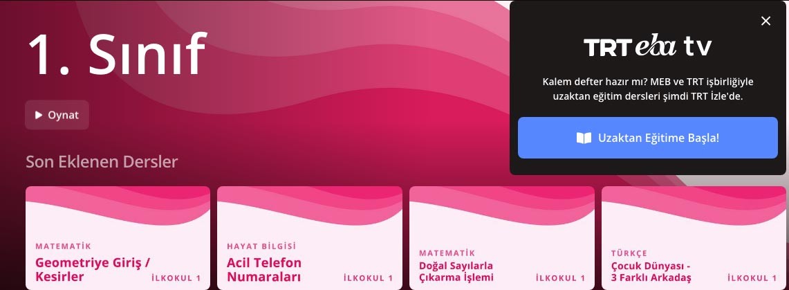Milyonlarca öğrenci TRT EBA TV üzerinden uzaktan eğitim için televizyon ve internet başına geçti. 23 Mart’ta ilk EBA TV uzaktan eğitim zili çalmasıyla birlikte ilkokul, ortaokul ve lise öğrencileri TRT EBA TV üzerinden ders başı yaptı. Milli Eğitim Bakanlığı EBA üzerinden günlük ve haftalık ilkokul, ortaokul ve lise ders programını açıkladı. Peki 1. Sınıf TRT EBA TV ders programı hangi saatlerde 1. Sınıf ders anlatımı var? İşte 1.sınıf TRT EBA TV Çarşamba ders programı canlı ders anlatım saati.
