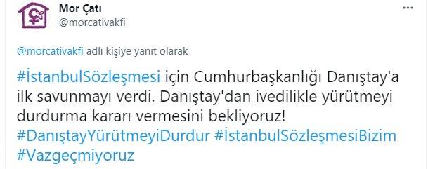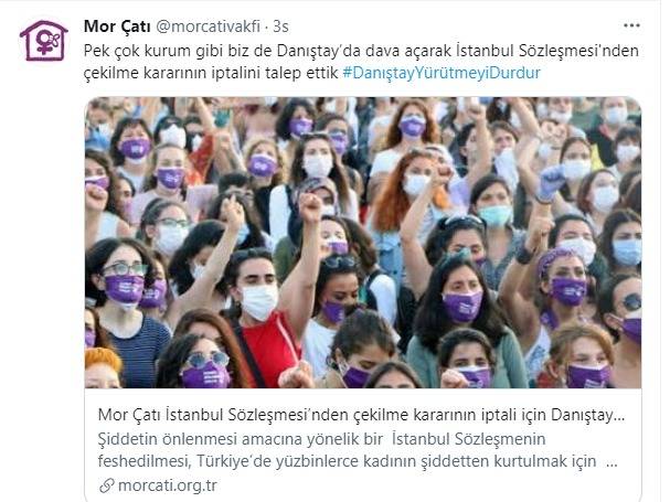 Davadan hala sonuç alamayan Mor Çatı, “İstanbul Sözleşmesi için Cumhurbaşkanlığı Danıştay'a ilk savunmayı verdi. Danıştay'dan ivedilikle yürütmeyi durdurma kararı vermesini bekliyoruz! #DanıştayYürütmeyiDurdur #İstanbulSözleşmesiBizim #Vazgeçmiyoruz” diyerek kadınları İstanbul Sözleşmesi kararına karşı sokağa dökmeyi hedefliyor.