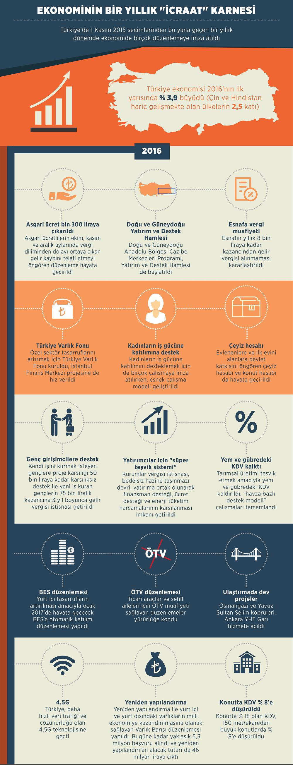 Türkiye'de 1 Kasım 2015 seçimlerinden bu yana geçen bir yıllık dönemde, asgari ücret artışından süper teşvik sistemine, yeniden yapılandırmadan Varlık Barışı uygulamasına kadar birçok önemli düzenlemeye imza atılırken, çeşitli alanlarda da istihdam, üretim ve yatırımı artıran çalışmalar gerçekleştirildi.