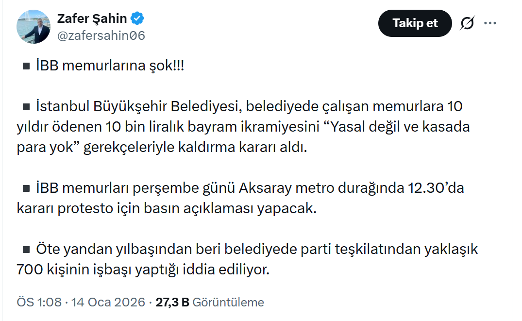 İstanbul Büyükşehir Belediyesi yönetiminin gerçek yüzü bir kez daha gün yüzüne çıktı. Zafer Şahin, sosyal medya hesabından yaptığı paylaşımla İBB'deki büyük vurgunu ve memura atılan kazığı gözler önüne serdi. 10 yıldır tıkır tıkır ödenen 10 bin liralık bayram ikramiyesine göz diken yönetim, "yasal değil" ve "para bitti" bahanelerinin arkasına sığınarak binlerce memurun hakkını bir gecede gasbetti.