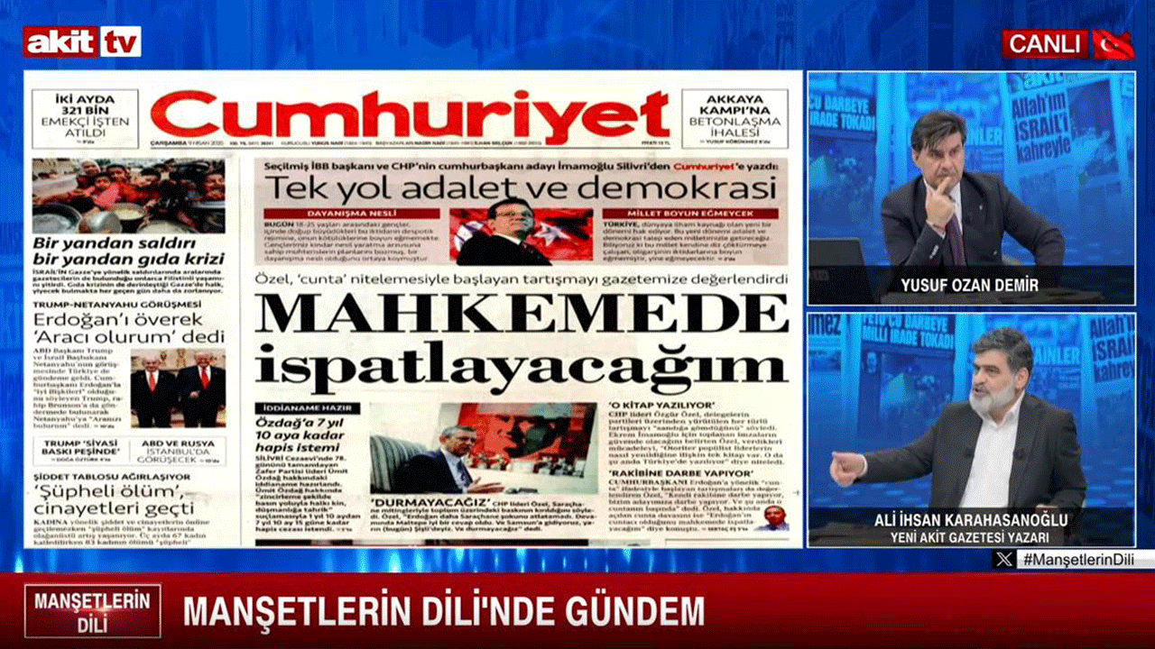 Yeni Akit Gazetesi Yazarı Ali İhsan Karahasanoğlu, Akit TV'de her sabah Türkiye gündeminin nabzını tutan ‘Manşetlerin Dili” programında, CHP Genel Başkanı Özgür Özel ile yolsuzluktan tutuklanan eski İBB Başkanı Ekrem İmamoglu’nun Türk yargısına karşı iki de birde yurt dışındaki ağababalarından yardım dilenmesini Kemalist tayfanın 100 yıldır kin kustuğu Vahdettin Han örneğiyle eleştirdi.