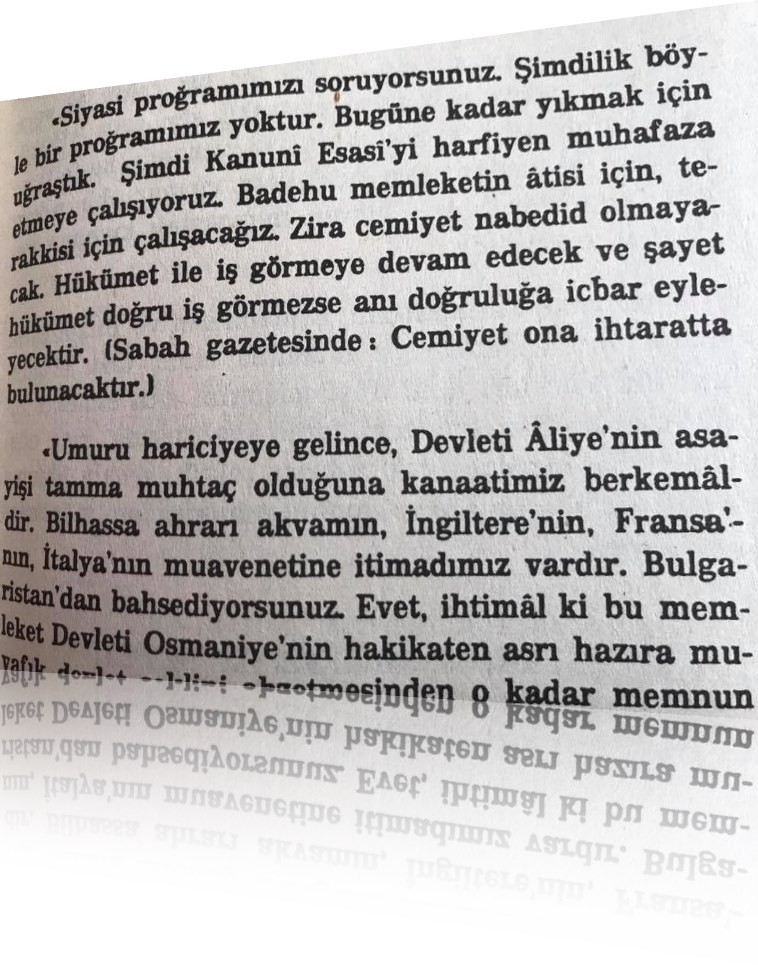 26 Temmuz 1908 tarihli ifadesinde Rahmi Bey, “Siyasi programımızı soruyorsunuz. Şimdilik böyle bir programımız yoktur. Bugüne kadar yıkmak için uğraştık. Şimdi Kanun-ı Esasi’yi harfiyen muhafaza etmeye çalışıyoruz. Badehu [Bundan sonra] memleketin atisi [ilerlemesi] için, terakkisi [yükselmesi] için çalışacağız.” diyor. Rahmi Bey sözlerini şöyle sürdürüyor: “Umûr-ı hariciyeye [dışişleri meseleleri] gelince. Bilhassa ahrar-ı akvamın [hürriyetçi toplumların], İngiltere’nin, Fransa’nın, İtalya’nın muavenetine [yardımına] itimadımız vardır.”