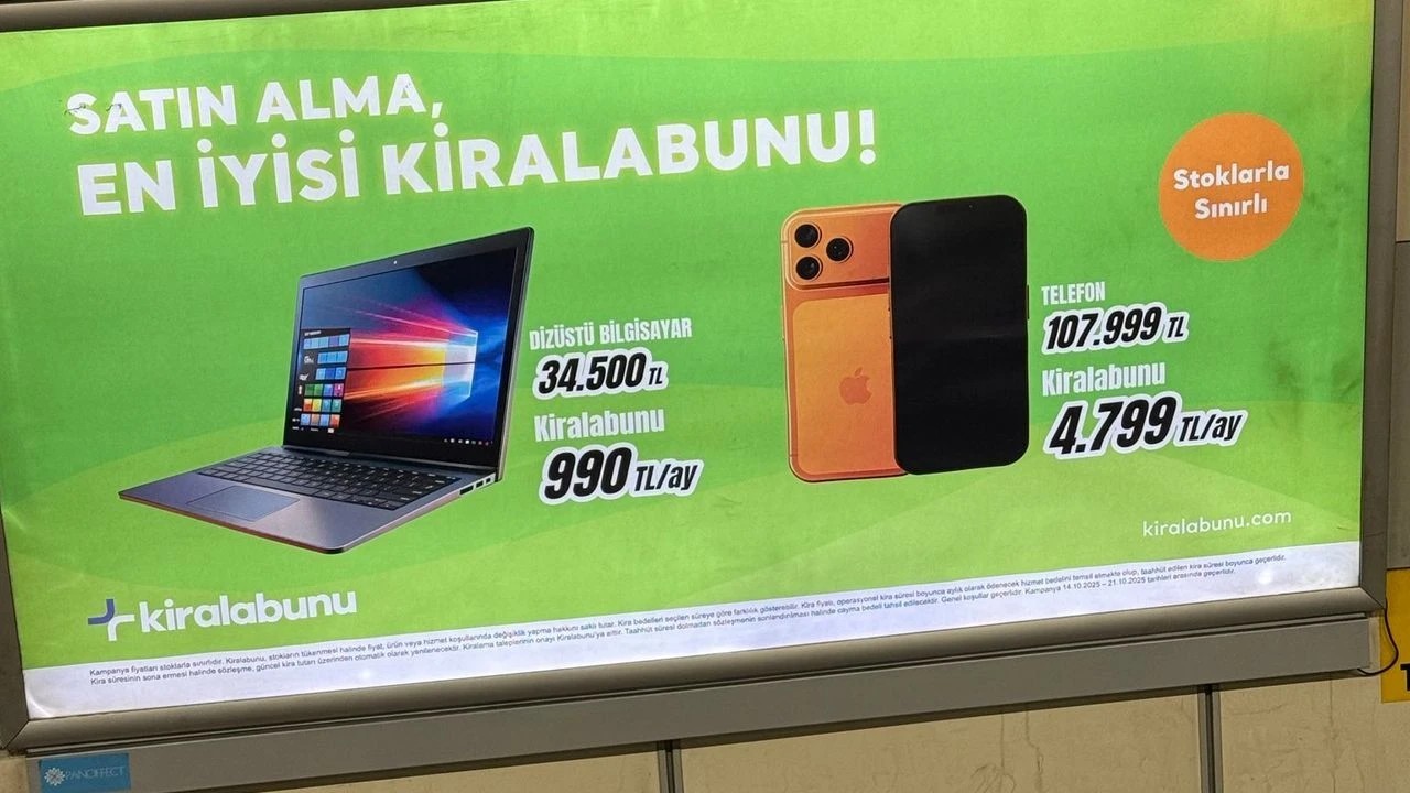Reklamda “Satın alma, en iyisi KiralaBunu!” sloganıyla, 34.500 TL’lik bir laptopun aylık 990 TL’ye, 107.999 TL’lik bir akıllı telefonun ise aylık 4.799 TL’ye kiralanabileceği belirtiliyor.
