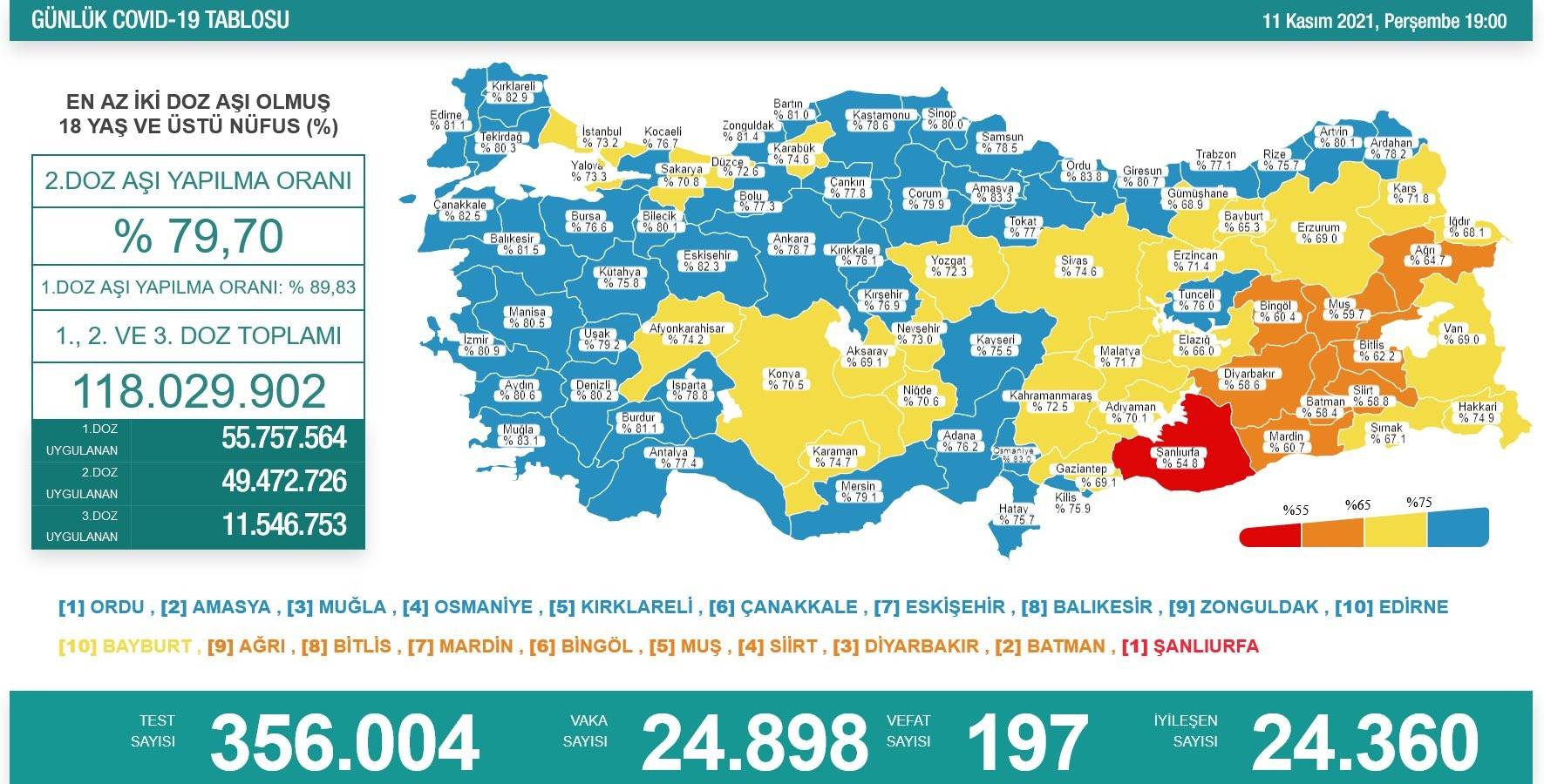 Türkiye'de son 24 saatte 356 bin 4 Kovid-19 testi yapıldı, 24 bin 898 kişinin testi pozitif çıktı, 197 kişi yaşamını yitirdi.