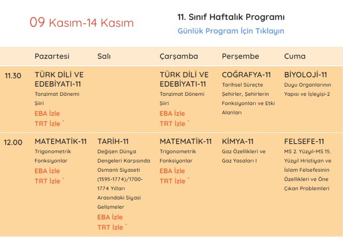 EBA üzerinden Milli Eğitim Bakanlığı (MEB) ilkokul, ortaokul ve lise ders programını açıklamakta. Yüz yüze eğitime başlamayan sınıflar arasında 11. Sınıflar da var. Binlerce 11. Sınıf öğrencisi canlı ders takibini yapmak için EBA üzerinden açıklanan ders programını takip ederek canlı ders saatlerini öğrenmekte. MEB 9-14 Kasım tarihleri arasında EBA TV canlı ders saatlerini açıkladı. İşte TRT EBA TV 11.sınıf canlı ders saatlerine ilişkin ders programı.