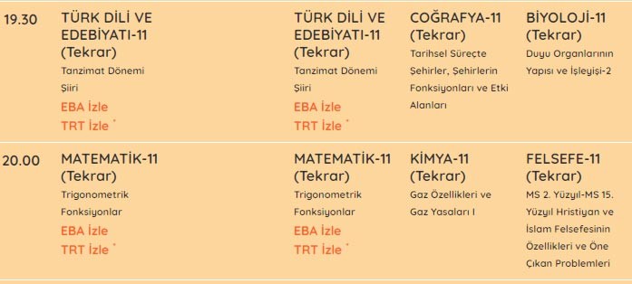 Milli Eğitim Bakanlığı tarafından EBA.gov.tr üzerinden açıkladığı ders programı üzerinden gerçekleştirilmekte. TRT EBA TV canlı ders saatleri için EBA haftalık ders programı yayınlanıyor. MEB EBA sitesi üzerinden yayınlanan canlı ders saatlerine göre, 12 Kasım Perşembe günü 11.sınıflar canlı ders saati 11:30’da Coğrafya dersi ile başlayacak. 11. Sınıflar Coğrafya dersinde Tarihsel Süreçte Şehirler, Şehirlerin Fonksiyonları ve Etki Alanları konuyu işleyecek. 11. Sınıflar 12 Kasım Perşembe günü canlı derste saatler 12:00’da gösterdiğinde kimya dersinden Gaz Özellikleri ve Gaz Yasaları Ikonusunu işleyecek. TRT EBA TV üzerinden 11. Sınıf öğrencileri ders tekrarlarını 19:30-20:00 saatleri arasında takip edebilecek.