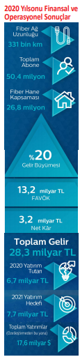 Ümit Önal, 2020 yılında başarılı bir performans sergilediklerini belirterek, “Konsolide gelirlerimiz yıllık bazda yüzde 20 arttı, halka arzdan bu yana en yüksek yıllık büyümeyi gördük.” dedi. Aynı dönemde operasyonel gelirlerin ve sabit genişbant segment gelirinin sırasıyla yüzde 17,2 ve yüzde 25 arttığını aktaran Önal, şöyle devam etti: “Konsolide faiz, amortisman ve vergi öncesi karı (FAVÖK), güçlü gelir büyümesi ve disiplinli faaliyet gider yönetimini yansıtarak yıllık yüzde 19 arttı. Yıl sonu öngörümüzün de üzerinde, 13,2 milyar TL’ye yükselirken, FAVÖK marjı yüzde 46,8 oldu. 2020 yılında net kar, yıl boyunca süren elverişsiz kur hareketlerine rağmen yıllık yüzde 32 artışla son 12 yılın en yüksek yıllık değeri olan 3,2 milyar TL’ye yükseldi. Yıl boyunca güçlü nakit akışı sağlamaya ve borçluluk oranımızı düşürmeye odaklandık. Bu konuda önceden beri attığımız istikrarlı adımlarla, yabancı para net kısa pozisyonumuzu yılın son çeyreğinde uzun döviz pozisyonuna çevirmeyi başardık. Yıl sonu itibarıyla 46 milyon dolar uzun döviz pozisyonumuz bulunuyor.”