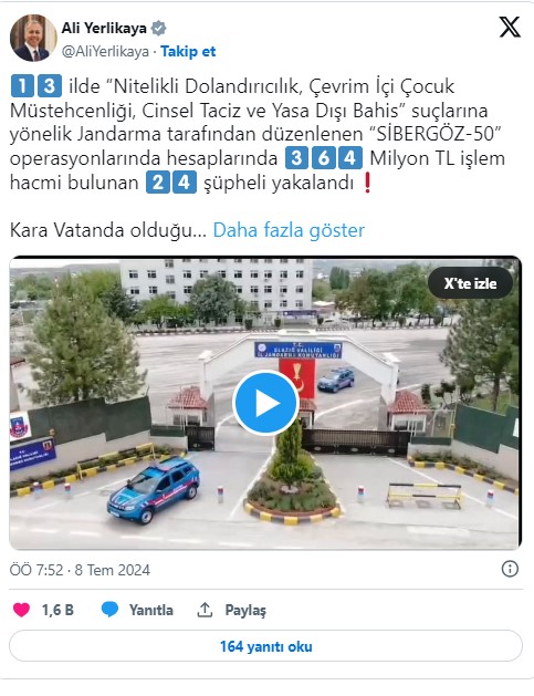 "Kara Vatanda olduğu gibi Siber Vatan’da da sanal devriyelerimiz 7 gün 24 saat görevlerinin başında. Operasyonları gerçekleştiren kahraman jandarmamızı tebrik ediyorum. Allah ayağınıza taş değdirmesin. Milletimizin duası sizinle."