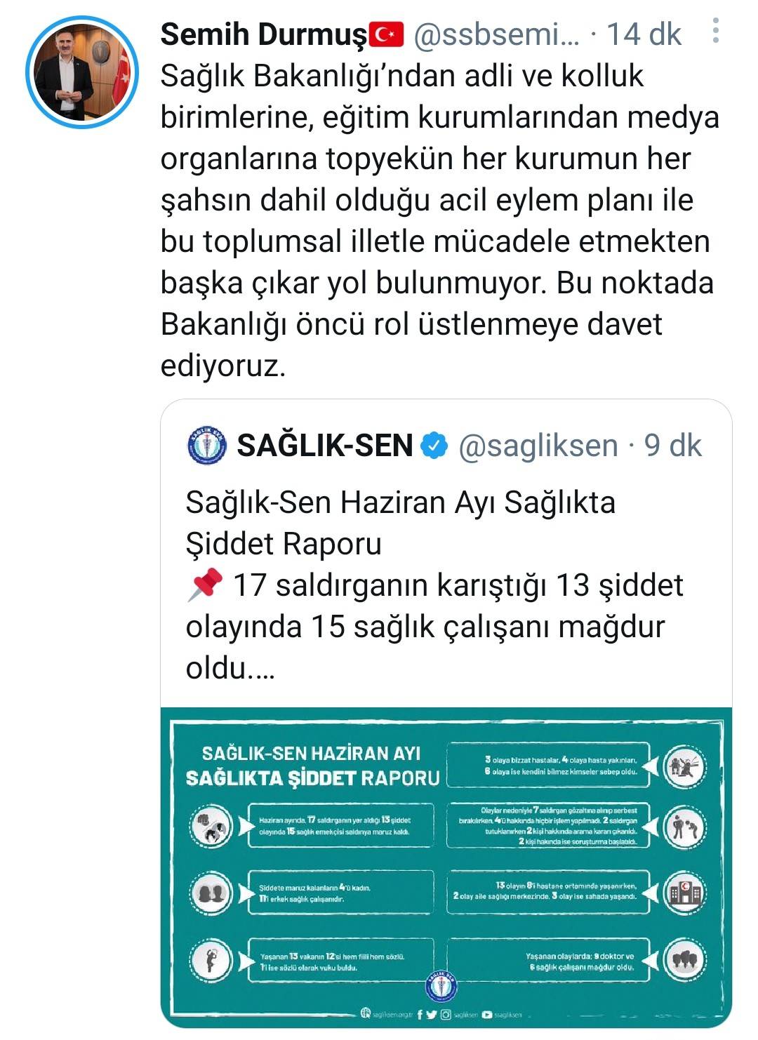 Sağlık-Sen Haziran Ayı Sağlıkta Şiddet Raporunu açıkladı. Raporda "Haziran ayı boyunca, Türkiye’nin aşılama hedefine giden yolda büyük özveriyle çalışan sağlık emekçilerine yönelik 13 şiddet vakası yaşandı. 17 saldırganın yer aldığı bu vakalar dolayısıyla 15 sağlık çalışanı mağdur oldu" denildi.