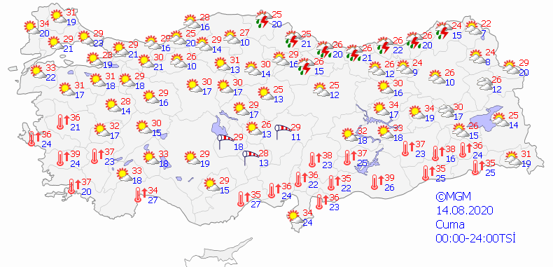 Meteoroloji Genel Müdürlüğü tarafından yapılan son değerlendirmelere göre: Ülkemizin kuzey kesimlerinin parçalı yer yer çok bulutlu, Orta ve Doğu Karadeniz kıyıları, Sinop, Tokat, Artvin ile Van'ın doğusu ve Ağrı'nın güneyinin yerel olmak üzere sağanak ve gök gürültülü sağanak yağışlı geçeceği tahmin ediliyor. Yağışların bugün (Cuma) sabah saatlerinde Samsun, Ordu ve Giresun, öğle saatlerinden sonra Trabzon'un doğusu, Rize ve Artvin kıyılarında yer yer kuvvetli (21-50 kg/metrekare) olması bekleniyor.