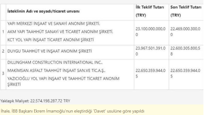 İkinci sırada ise 23 milyar 100 milyon TL ile Yapı Merkezi, üçüncü sırayı ise 23 milyar 900 milyon TL'lik teklifiyle Duygu şirketi aldı.
