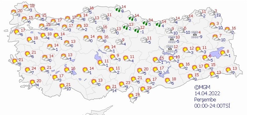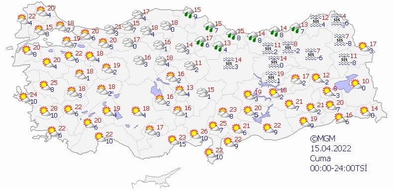 Meteoroloji Genel Müdürlüğü tarafından yapılan son değerlendirmelere göre: Ülkemizin kuzey ve doğu kesimlerinin parçalı ve yer yer çok bulutlu, bu akşam saatlerinde Kars çevrelerinin, gece saatlerinden sonra Kastamonu kıyıları, Sinop, Samsun, Amasya, Tokat, Giresun ve Ordu çevrelerinin yağışlı, diğer yerlerin az bulutlu ve açık geçeceği tahmin ediliyor. Yağışların, kıyı kesimlerde yağmur ve sağanak, yağış alan diğer yerlerde ise karla karışık yağmur ve kar şeklinde görülmesi bekleniyor. Karadeniz'in iç ve yüksek kesimleri ile Doğu Anadolu'da yüksek kar örtüsüne sahip eğimli bölgelerde çığ riski bulunmaktadır. İç ve doğu kesimlerde gece ve sabah saatlerinde buzlanma ve don ile birlikte yer yer sis ve pus olayı bekleniyor.
