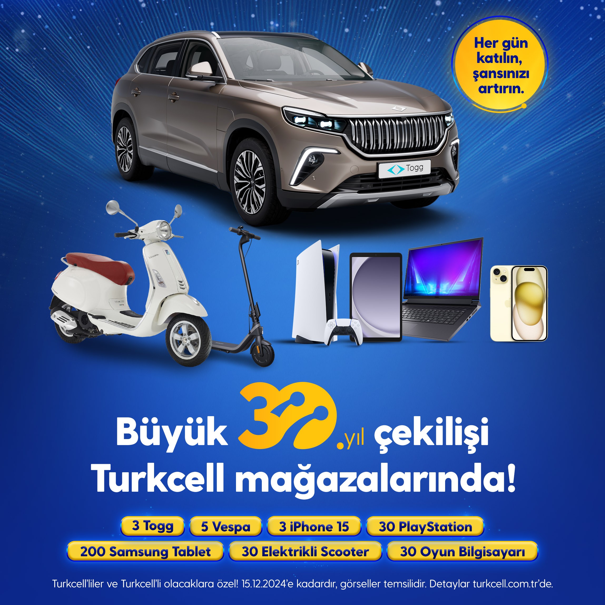 Turkcell’in 30. yılını müşterileriyle birlikte kutlamak için başlattığı dev çekiliş kampanyası hız kesmeden devam ediyor. Çekiliş kampanyası kapsamında, 3 adet Togg, 5 Vespa, 3 iPhone 15, 30 Playstation, 30 elektrikli scooter, 200 Samsung tablet ve 30 oyun bilgisayarı gibi büyük ödüller, şanslı Turkcell’lileri ve Turkcell ailesine yeni katılacak müşterileri bekliyor.