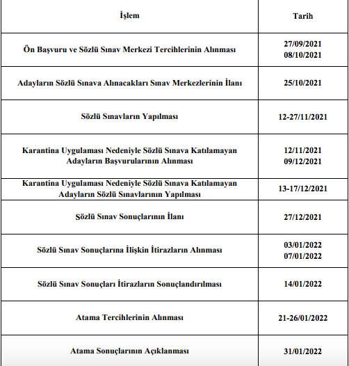 Karantina uygulaması nedeniyle sözlü sınava katılamayan adayların başvuruları ise 12 Kasım-9 Aralık'ta alınacak ve bu adayların sözlü sınavları 13-17 Aralık'ta düzenlenecek. Sözlü sınav sonuçları 27 Aralık'ta ilan edilecek. Öğretmen adaylarının atama tercihleri 21-26 Ocak 2022'de alınacak ve 15 bin sözleşmeli öğretemnlik atama sonuçları 31 Ocak 2022'de açıklanacak. Bu takvime göre yapılacak atama işleminde, 2020 ve 2021 KPSS puanları ile başvurular alınacak.