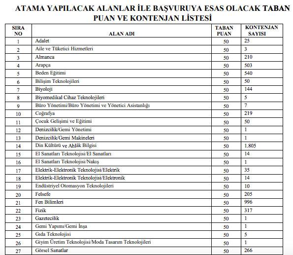 ATAMA YAPILACAK ALANLAR İLE BAŞVURUYA ESAS OLACAK TABAN PUAN VE KONTENJAN LİSTESİ İÇİN TIKLAYIN