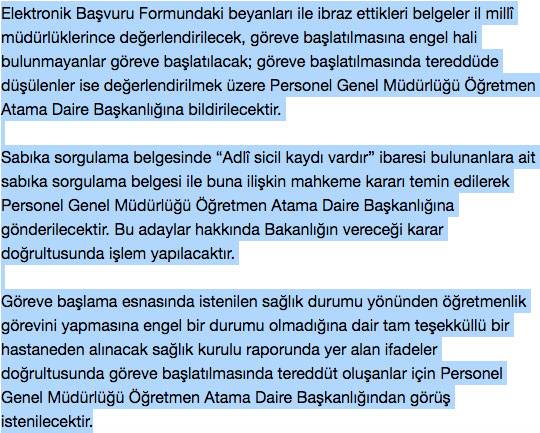 (Not: İl veya ilçe millî eğitim müdürlükleri adayın elektronik başvuru formundaki beyan ettiği bilgilerle atamaya esas belgelerin uyuşup uyuşmadığını kontrol edecekler ve atamaya esas belgelerden birer nüsha alarak onaylanıp adayın özlük dosyasında muhafaza etmek üzere saklayacaklardır. Bilgilerin uyuşmaması halinde durum Personel Genel Müdürlüğüne bildirilecektir.)