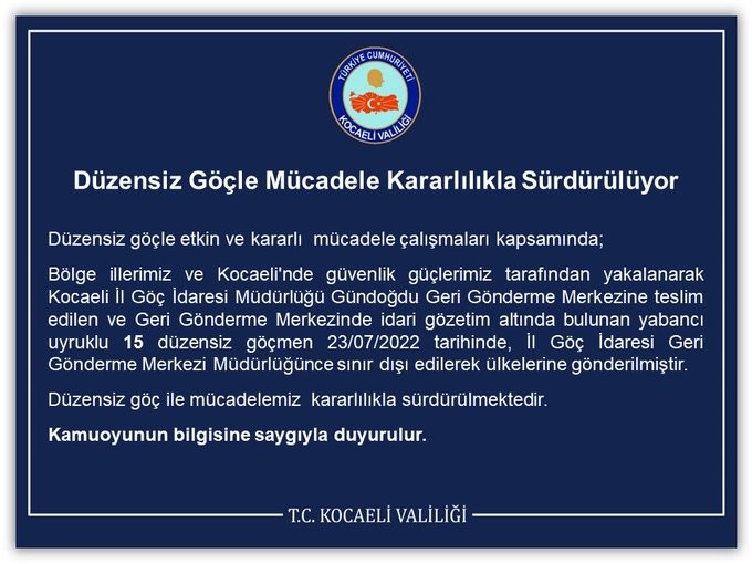 Düzensiz göçle etkin ve kararlı mücadele çalışmaları kapsamında; Bölge illerimiz ve Kocaeli'nde güvenlik güçlerimiz tarafından yakalanarak Kocaeli İl Göç İdaresi Müdürlüğü Gündoğdu Geri Gönderme Merkezine teslim edilen ve Geri Gönderme Merkezinde idari gözetim altında bulunan yabancı uyruklu 15 düzensiz göçmen 23/07/2022 tarihinde, İl Göç İdaresi Geri Gönderme Merkezi Müdürlüğünce sınır dışı edilerek ülkelerine gönderilmiştir. Düzensiz göç ile mücadelemiz kararlılıkla sürdürülmektedir, Kamuoyunun bilgisine saygıyla duyurulur. KOCAELİ VALİLİĞİ”