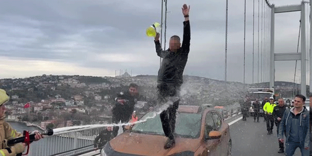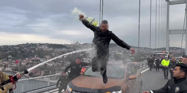İstanbul'da 15 Temmuz Şehitler Köprüsü'nde garip anlar yaşandı. Gözü dönen bir vatandaş aracının üzerine çıkıp benzin döken düktü. Tüm ikna çabalarına rağmen vazgeçmeyince ekiplerden hortumlu müdahale gecikmedi. Bu müdahaleye öfkelenen şahıs koşmak isteyince başına gelenler saniye saniye görüntülendi.