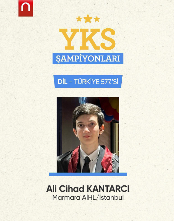 Sınavda büyük başarıya imza atan Marmara Anadolu İmamhatip öğrencisi Ali Cihad Kantarcı'nın YKS Dil sınavında Türkiye 577’ncisi olduğu öğrenildi.