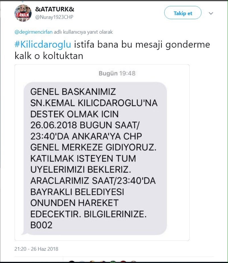 "Genel Başkanımız Sayın Kemal Kılıçdaroğlu'na destek olmak için 26.06.2018 bugün saat 23:40'da Ankara'ya CHP Genel Merkeze gidiyoruz. Katılmak isteyen tüm üyelerimizi bekleriz. Araçlarımız saat 23:40'da Bayraklı Belediyesi önünden hareket edecektir. Bilgilerinize..." diye mesaj atıldı.