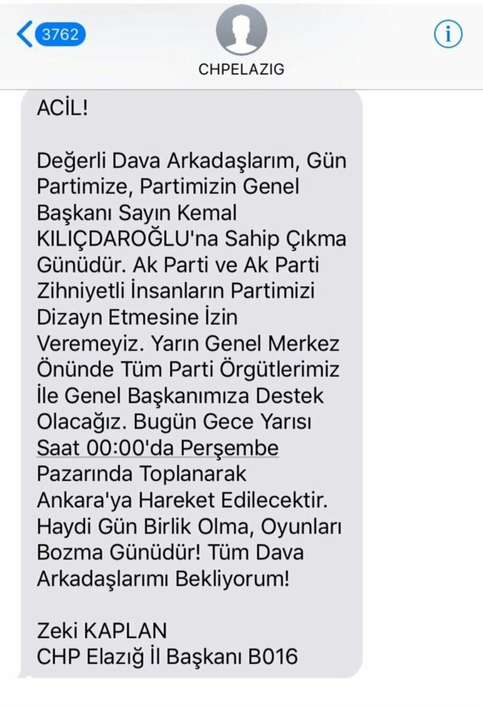 "Değerli dava arkadaşlarım, gün partimize, parti genel başkanımız Sayın Kemal Kılıçdaroğlu'an sahip çıkma günüdür. Ak Parti ve Ak Parti zihniyetli insanların partimizi dizayn etmesine izin veremeyiz. Yarın genel merkez önünde tüm parti örgütlerimiz ile genel başkanımıza destek olacağız. Bugün gece yarısı saat: 00:00'da Perşeme Pazarında toplanarak Ankara'ya hareket edilecektir. Haydi gün birlik olma, oyunları bozma günüdür! Tüm dava arkadaşlarımı bekliyorum!"