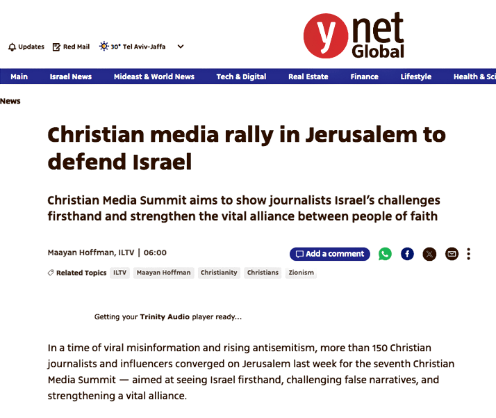 Yahudi Yedioth Ahronoth gazetesinin haberine göre Kudüs’te yapılan Hristiyan Medya Zirvesi, batılı gazetecilere İsrail’in zorluklarını ilk elden göstermeyi ve aradaki hayati ittifakı güçlendirmeyi amaçladı.