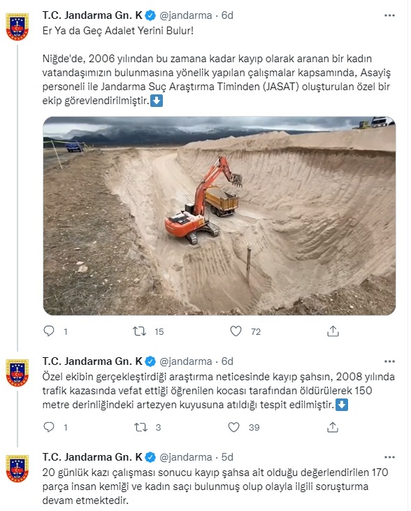 2006 yılında kaybolan bir kadının bulunmasına yönelik başlatılan arama çalışmalarına ilişkin Jandarma Genel Komutanlığı sosyal medya hesabı üzerinden yaptığı paylaşımlarla durumu vatandaşlarla paylaştı. Jandarma Genel Komutanlığı sosyal medya hesabı üzerinden “Er Ya da Geç Adalet Yerini Bulur!” diyerek yaptığı paylaşımda, “Niğde'de, 2006 yılından bu zamana kadar kayıp olarak aranan bir kadın vatandaşımızın bulunmasına yönelik yapılan çalışmalar kapsamında, Asayiş personeli ile Jandarma Suç Araştırma Timinden (JASAT) oluşturulan özel bir ekip görevlendirilmiştir. Özel ekibin gerçekleştirdiği araştırma neticesinde kayıp şahsın, 2008 yılında trafik kazasında vefat ettiği öğrenilen kocası tarafından öldürülerek 150 metre derinliğindeki artezyen kuyusuna atıldığı tespit edilmiştir. 20 günlük kazı çalışması sonucu kayıp şahsa ait olduğu değerlendirilen 170 parça insan kemiği ve kadın saçı bulunmuş olup olayla ilgili soruşturma devam etmektedir” ifadelerini kullandı.