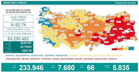 18 Temmuz koronavirüs tablosu yeni vaka, hasta ve vefat sayılarında son durum merak ediliyor. Sağlık Bakanlığı son dakika 18 Temmuz koronavirüs tablosu verileri merak ediliyor. Türkiye’de son 24 saatte 233 bin 946 Kovid-19 testi yapıldı, 7 bin 680 kişinin testi pozitif çıktı, 66 kişi hayatını kaybetti. Sağlık Bakanlığı tarafından 18 Temmuz 2021 koronavirüs tablosu paylaşıldı. Bakan Koca yaptığı açıklamada, "Aydın, İzmir ve Tekirdağ maviye yaklaştı. Tedbirlere taviz vermeden uyalım. Bayramda tedbirlere uymak bayram sonrasını da bayram eder." dedi.