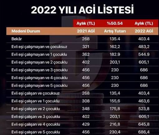 2022 yılında bekar biri için AGİ 402 lira oldu. Evli eşi çalışmayan ve çocuksuz biri için AGİ 481,5 lira, evli eşi çalışmayan ve 1 çocuklu biri için AGİ 543 lira oldu.