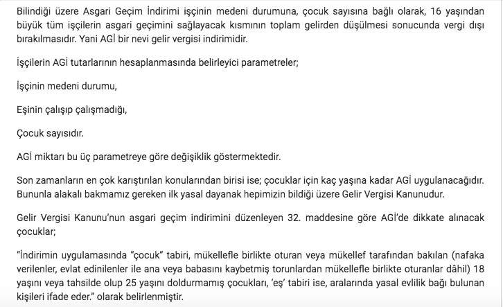 2007’den önce vergi iade zarfları vardı. Tüm çalışanlar yıl boyu alışverişlerinde topladıkları fiş ve faturaları zarfa yazıp işyerlerine verip vergi iadesi alıyorlardı. 2007’den itibaren vergi iadesi kaldırılarak yerine AGİ uygulaması geldi. İşverenler, çalışanların ücretleri üzerinden hesapladıkları vergiyi, AGİ kadar daha az ödüyorlar vergi dairesine. Hesaplanan AGİ’yi de çalışana net ücretlerine ilaveten ödüyorlar. AGİ’nin hesabı ise asgari ücret üzerinden yapılıyor. AGİ’den kaynaklı çalışana ödenecek yıllık tutar; yıllık asgari ücretin yarısına yüzde 15 oranı uygulanarak bulunuyor (GVK Md. 32).