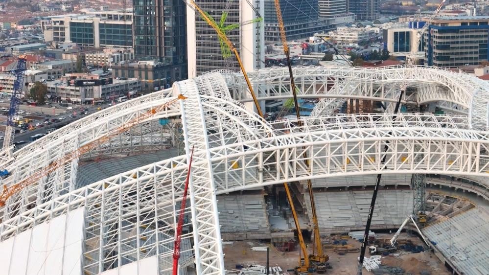 Ankara'nın simgesi olacak 19 Mayıs Stadyumu'nun inşaatı hızla ilerliyor. Drone ile kaydedilen son görüntülerde, stadyumun çelik çatısının montaj aşamasına geldiği ve yapısal iskeletin büyük ölçüde tamamlandığı görüldü.