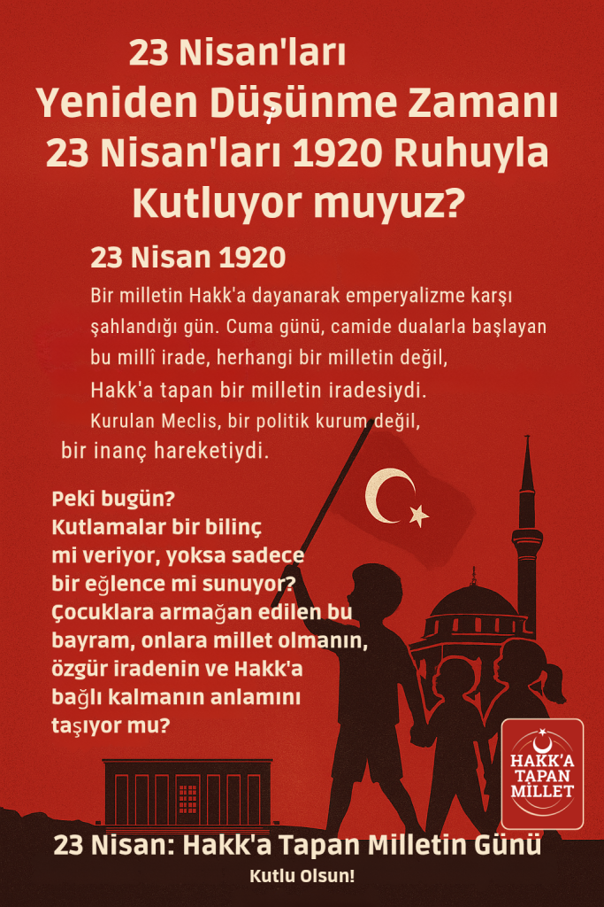 23 Nisan’ı; sadece çocuklara yönelik bir bayram değil, Allah’a tapan bir milletin bağımsızlık gününü idrak ederek kutlamalıyız. Egemenlik anlayışımızı yeniden o manevi temellere oturtmalı, çocuklarımıza sadece neşe değil; kimlik, şahsiyet ve şuur da kazandırmalıyız.