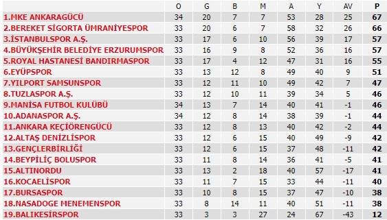 36. hafta maçları öncesi 57'şer puana sahip İstanbulspor ile Büyükşehir Belediye Erzurumspor play-off oynamayı garantiledi. Bu iki takımın dışında 55 puanlı Royal Hastanesi Bandırmaspor ile 51 puanlı Eyüpspor, son 3 haftaya play-off için avantajlı durumda girdi.