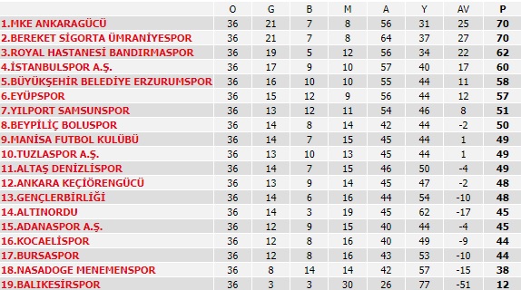 Ligde dün tamamlanan normal sezon maçlarının ardından MKE Ankaragücü'nün şampiyon tamamladığı 1. Lig'de ikinciliği averajla Bereket Sigorta Ümraniyespor elde etti. Bu iki takımı izleyen Royal Hastanesi Bandırmaspor, İstanbulspor, Büyükşehir Belediye Erzurumspor ve Eyüpspor'dan biri daha play-off'ta Süper Lig vizesi almak için mücadele edecek.