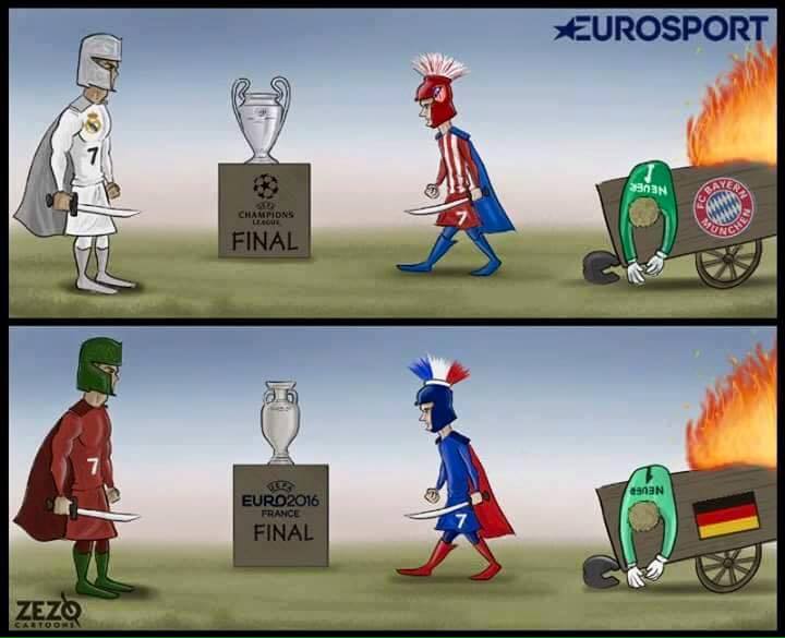 Portekiz’in yıldız futbolcusu Cristiano Ronaldo ile Fransa’nın yıldızı Antoine Griezmann, 2016’da UEFA Şampiyonlar Ligi’nden sonra Avrupa Futbol Şampiyonası finalinde de karşı karşıya gelecek. EURO 2016 final karşılaşması, bu organizasyonda Portekizli Cristiano Ronaldo’nun kariyerinde oynayacağı ikinci, Fransız Antoine Griezmann’ın ise ilk finali olacak.