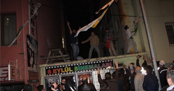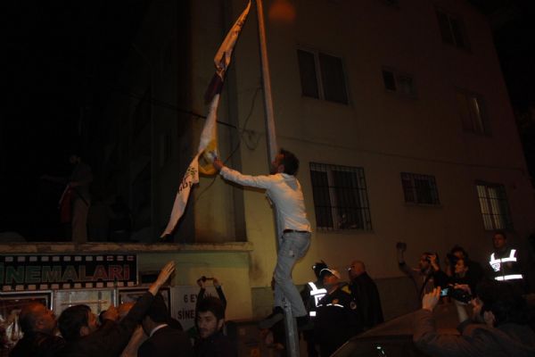 Kalabalıktakiler, HDP il binasının önündeki parti bayraklarının indirilmesi, yerine Türk Bayrağı asılmasını istedi. Emniyet Müdürlüğü yetkilileri de HDP il Başkanı Ekrem Bedevi ile görüşme yaptı. Görüşmenin ardından kalabalık içerisinden bir genç elinde Türk Bayrağı ile polislerle birlikte HDP il binasına girdi. Elinde bayrak olan genç ve polisler binaya bayrağı asamadan çıkınca dışarıdaki kalabalık, polislerin oluşturduğu barikatı aşıp HDP il binası önünde asılı parti bayraklarını indirip, yerine Türk Bayrağı astı. Kalabalık çeşitli sloganlar attıktan sonra dağıldı.
