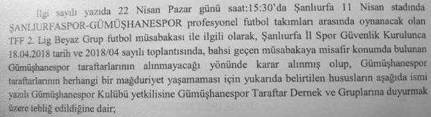 Bu durumla ilgili Şanlıurfaspor cephesinden gelen baskılar sonucunda Şanlıurfa İl Güvenlik Kurulu, karşılaşmaya Gümüşhanespor taraftarının da giremeyeceğini, maçın tamamen seyircisiz oynanacağını açıkladı.